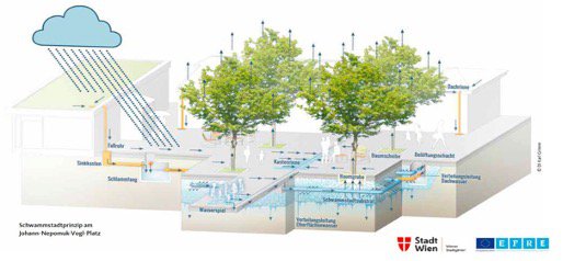 Nelle aree urbane si presentano alcuni problemi, tra i quali la compattazione del suolo dovuta al traffico stradale, l’immissione di sale stradale e l’urina dei cani, ma anche la mancanza di spazio per le radici. Chiariamo un principio fondamentale: i vecchi alberi sono insostituibili! Prima di abbattere vecchi alberi senza esaminare alternative, si dovrebbe considerare con attenzione i casi di periodi di vegetazione molto. Per la riprogettazione di spazi aperti nelle aree urbane, il principio della città spugna è un’opportunità per fornire buone condizioni di crescita per gli alberi e allo stesso tempo migliorare la gestione delle acque piovane. Questo si ottiene evitando di scaricare nella rete fognaria l’acqua che scorre sulle superfici impermeabilizzate, immettendola invece nel terreno che circonda le radici degli alberi. Per garantire una sufficiente qualità dell’acqua, vengono a tale scopo utilizzate solo le acque in classe F1 (deflusso da marciapiedi, piste ciclabili e tetti degli edifici). Questo smaltimento delle acque serve non solo alla crescita degli alberi ma allo stesso tempo, attraverso l’evaporazione, favorisce il raffrescamento della temperatura a livello locale. Se, oltre al principio della città spugna, si aggiungono anche tetti e facciate verdi, si può ottenere un uso a cascata dell’acqua piovana.